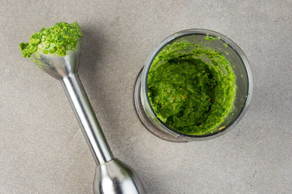 Wenn es mal wieder etwas schneller gehen muss, aber unser verwöhnter Gaumen keine Kompromisse eingehen will, ist dieses Pastagericht die richtige Wahl! Während die Penne im Topf vor sich hin sprudelt, zaubern wir ein delikates Pesto aus gerösteten Sonnenblumenkernen, Babyspinat, würzigem Käse und Trüffelöl. Dazu braten wir Tomaten, Paprikastreifen und zartes Hähnchen in der Pfanne – et voilà: Es ist angerichtet!