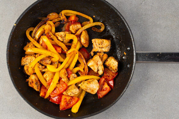 In einem großen Topf ausreichend gesalzenes Wasser für die Pasta zum Kochen bringen. Die Paprika vierteln, entkernen und in dünne Streifen schneiden. Die Tomaten in 1–2cm große Stücke schneiden. Das Fleisch trocken tupfen und mit je ½TL Salz und Pfeffer würzen.