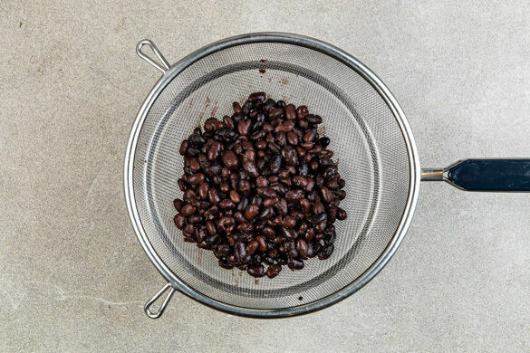 Inzwischen die Bohnen in einem Sieb mit kaltem Wasser abspülen und abtropfen lassen.
