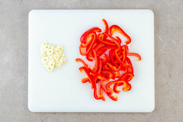 In einem Wasserkocher ausreichend Wasser für die Pasta zum Kochen bringen. Die Paprika vierteln, entkernen und in dünne Scheiben schneiden. Den Knoblauch schälen, halbieren und in dünne Scheibchen schneiden.
