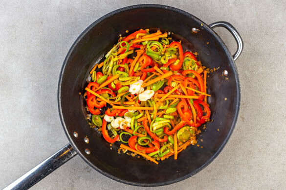 Den Gemüsemix und die Paprika in derselben Pfanne mit 1EL Olivenöl bei starker Hitze 3–4Min. braten. Dann den Knoblauch dazugeben und 2–3Min. bei mittlerer Hitze mitbraten, bis das Gemüse gar, aber noch knackig ist.