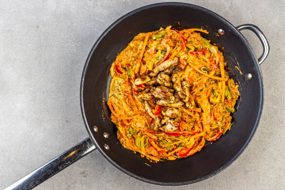 Das Fleisch samt Bratensaft zurück in die Pfanne geben. Die Crème fraîche und das Pesto einrühren und alles 1–2Min. erwärmen.