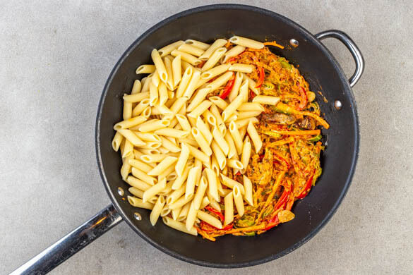 Zeit, die man mit Pasta verbringt, ist gute Zeit. Und damit wir nachher mehr davon haben, kochen wir einfach ganz schnell: Während die Penne brodeln, braten wir fix all’italiana gewürztes Hähnchen, einen knackigen Gemüsemix und Paprika. Dann kommen die Geheimwaffen: Crème fraîche und ein lecker-aromatisches Pesto aus getrockneten Tomaten und Oliven. Pasta dazu, schon kannst du auftischen. Buon appetito!