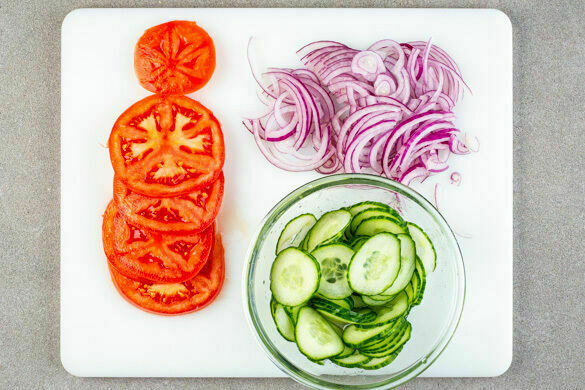 Die Tomaten in dünne Scheiben schneiden. Die Zwiebel schälen, halbieren und in feine Streifen schneiden. Die Gurke quer in dünne Scheiben schneiden, dann mit 4EL hellem Essig und je 1/2TL Salz und Zucker vermengen.
