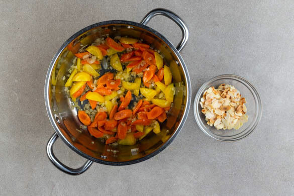 Die Mandeln in einem mittelgroßen Topf ohne Fett bei mittlerer Hitze 1–2Min. goldbraun rösten, dann aus dem Topf nehmen. Vorsicht, sie werden schnell dunkel. Die Zwiebeln schälen und fein würfeln. Die Karotten ggf. schälen, längs halbieren und in dünne Scheiben schneiden. Die Zwiebeln und die Karotten in dem Topf mit 3EL Butter bei mittlerer Hitze 5–6Min. braten.