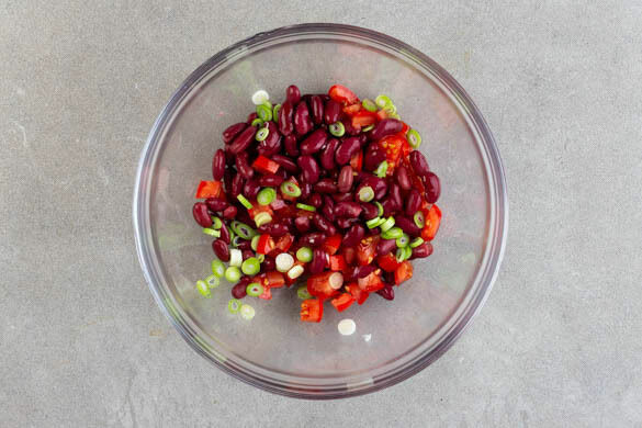 2EL Olivenöl, 2TL Essig sowie je 1 Prise Salz und Zucker gut verrühren. Die Tomaten in ca. 1cm große Würfel schneiden. Die Lauchzwiebeln in feine Ringe schneiden. Die Bohnen in einem Sieb mit kaltem Wasser abspülen und abtropfen lassen. Die Tomaten, die Lauchzwiebeln und die ½ der Bohnen mit dem Dressing zu einem Salat vermengen.