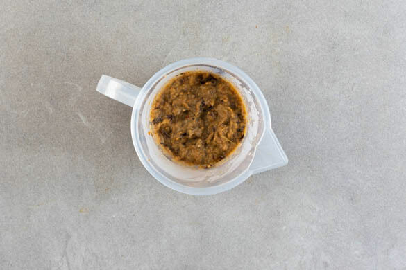 Das Backblech aus dem Ofen nehmen, das Fleisch zum Auskühlen beiseitestellen und die Auberginen samt Bratensaft mit je 1 Prise Salz und Zucker in das hohe Gefäß zu den Chiliflocken geben. Mit einem Stabmixer grob pürieren, dann den Dip mit mehr Salz und Zucker abschmecken.