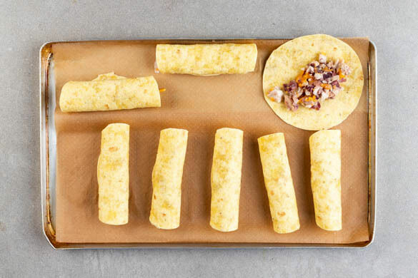 Je 1–2EL Füllung auf die Tortillas geben und mittig verteilen. Die Tortillas zigarrenförmig aufrollen und mit der Naht nach unten auf das mit Backpapier ausgelegte Backblech geben. Mit insgesamt 1EL Olivenöl bestreichen und im Ofen in 8–10Min. goldbraun backen. Die Taquitos auf Teller verteilen, mit dem Auberginendip und dem Tomaten-Bohnen-Salat anrichten und servieren.