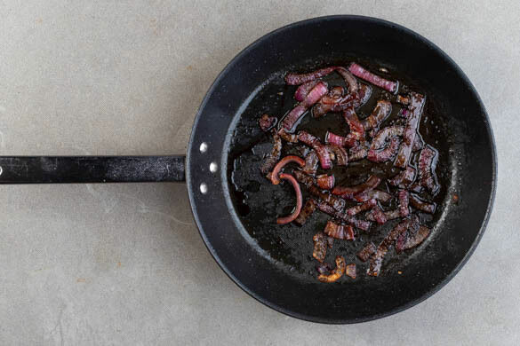 Die Zwiebeln in einer kleinen Pfanne mit 1EL Olivenöl und 1 kräftigen Prise Salz bei mittlerer Hitze in ca. 10Min. weich braten. Ggf. mit 1EL Wasser vom Pfannenboden lösen. Mit 1EL Balsamicoessig ablöschen und 2–5Min. einköcheln lassen.