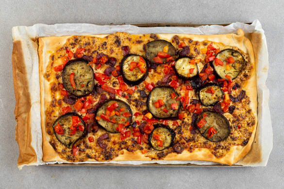 Den Teig mit dem Papier nach unten auf dem Backblech ausrollen und gleichmäßig mit dem Aufstrich bestreichen. Zuerst mit den Zwiebeln, dann mit den Auberginen und den Tomaten belegen. Den Flammkuchen mit 1 kräftigen Prise Pfeffer würzen und im Ofen 10–12Min. backen, bis der Teig goldbraun und an den Rändern knusprig ist.