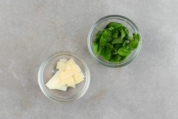 Den restlichen Käse mit einem Sparschäler in dünne Scheiben hobeln. Die Basilikumblätter von den Stängeln zupfen. Den Flammkuchen mit dem Käse und dem Basilikum garnieren, nach Belieben in Stücke schneiden und servieren.