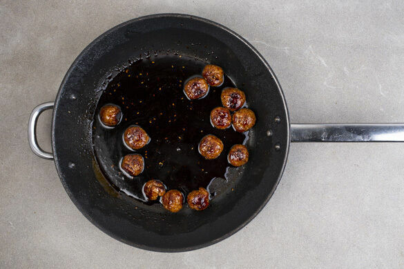 Die Hackbällchen in einer großen Pfanne mit 1EL Pflanzenöl bei mittlerer Hitze 5–8Min. rundum braten, bis sie goldbraun und fast gar sind. Die Teriyakisauce dazugeben und unter Rühren kurz eindicken lassen, bis alle Hackbällchen mit einer sämigen Sauce bedeckt und gar sind. Mit Salz und Pfeffer abschmecken und bis zum Servieren warm halten.