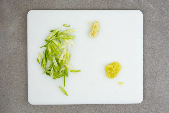 In einem mittelgroßen Topf ausreichend gesalzenes Wasser für die ½ der Nudeln zum Kochen bringen. Den Knoblauch schälen und fein würfeln. Die ½ des Ingwers schälen und fein reiben. Tipp: Wer mag, kann auch mehr Ingwer verwenden oder nutzt den restlichen Ingwer zum Aufbrühen eines Tees. Die Lauchzwiebel schräg in feine Ringe schneiden.