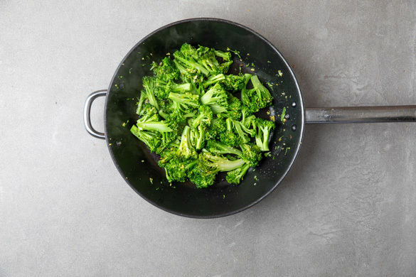 Den Brokkoli in 2–3cm große Röschen schneiden. Den restlichen Ingwer in derselben Pfanne mit 1EL Pflanzenöl erhitzen, dann den Brokkoli und 4–6EL Wasser dazugeben und abgedeckt bei mittlerer Hitze 3–4Min. dämpfen. Anschließend ohne Deckel köcheln lassen, bis das Wasser verdampft ist.