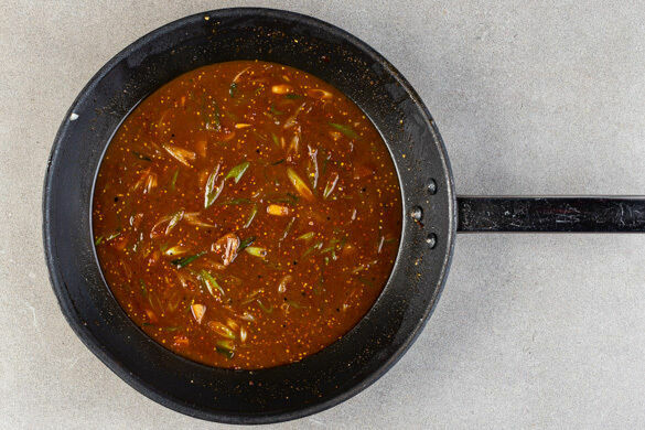 Den Knoblauch schälen und grob würfeln. Die Lauchzwiebeln schräg in dünne Ringe schneiden, das Lauchzwiebelgrün für die Garnitur beiseitelegen. Den Knoblauch und die weißen Lauchzwiebeln in derselben Pfanne mit 3EL Butter bei mittlerer bis niedriger Hitze 1–2Min. anschwitzen. Die ½ des Brühgewürzes, die Misopaste, 1EL Senf und 200ml Wasser einrühren.