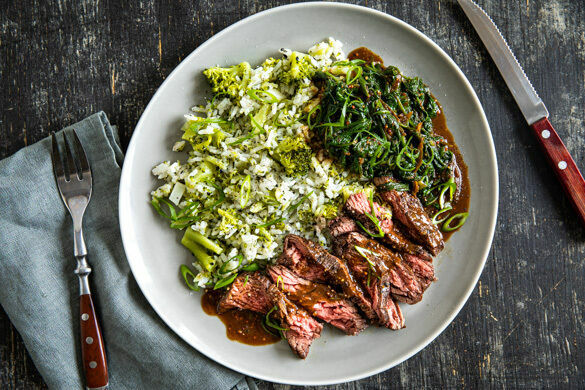 Mit diesem Rindersteak-Rezept wirst du in Zukunft sicher öfters punkten. Das schmackhafte Bio-Fleisch kommt nämlich in Begleitung eines delikaten Spinats daher, der in japanischer Misopaste zubereitet wird. Als Beilage trumpft der Brokkoli auf: Er wird ganz stressfrei zusammen mit duftendem Jasminreis geköchelt und dann mit viel Liebe und Sesam serviert. Bestnoten sind für diesen Publikumsliebling garantiert!