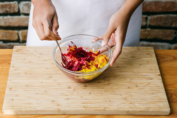 Inzwischen die Beten schälen und mit einer Küchenreibe grob raspeln. Tipp: Da Rote Bete stark färbt, beim Verarbeiten am besten Küchenhandschuhe und Schürze tragen. Mit 4EL Essig, 1½TL Zucker und je 1 kräftigen Prise Salz und Pfeffer gut vermengen.