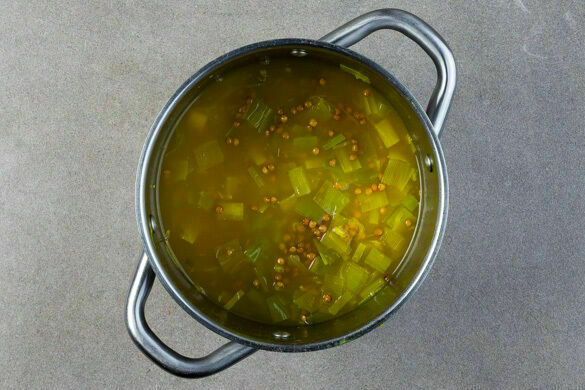 Den Lauch in einem großen Topf mit 1EL Olivenöl und 2 Prisen Salz bei mittlerer Hitze 2–3Min. anbraten. Den Knoblauch und das Kurkumapulver unterrühren und ca. 1Min. mitbraten. Dann die Linsen, das Brühgewürz und 1,5L kochendes Wasser unterrühren und den Eintopf abgedeckt ca. 15Min. köcheln lassen. Im Wasserkocher 800ml Wasser zum Kochen bringen.