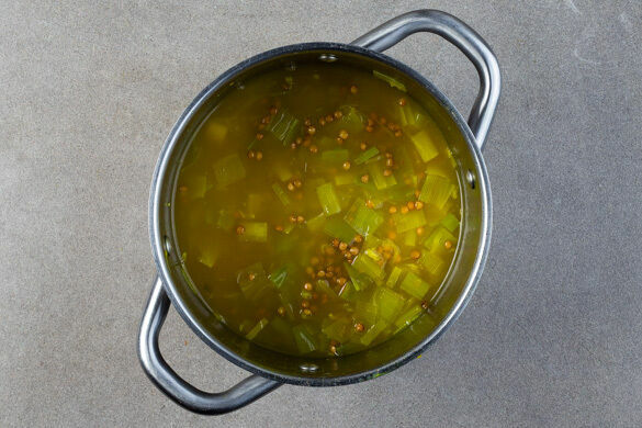 Den Lauch in einem mittelgroßen Topf mit 1EL Olivenöl und 1 Prise Salz bei mittlerer Hitze 2–3Min. anbraten. Den Knoblauch und die ½ des Kurkumapulvers unterrühren und ca. 1Min. mitbraten. Dann die Linsen, das Brühgewürz und 800ml kochendes Wasser unterrühren und den Eintopf abgedeckt ca. 15Min. köcheln lassen.