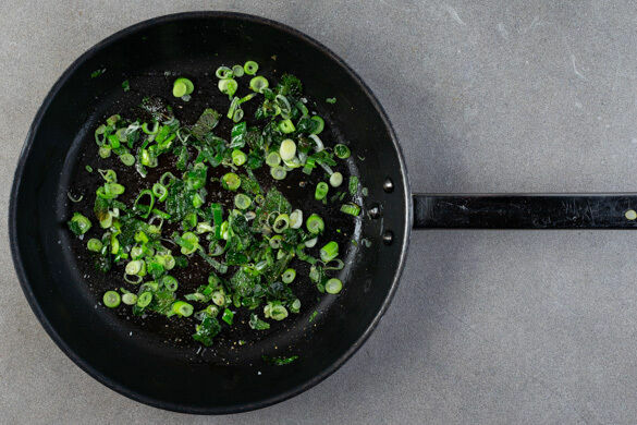 Die Minzeblätter von den Stängeln zupfen und grob schneiden. Die Lauchzwiebel in dünne Ringe schneiden. Die Minze und die Lauchzwiebeln in einer kleinen Pfanne mit 2EL Olivenöl und 1 Prise Salz bei niedriger Hitze 4–5Min. braten, bis die Lauchzwiebeln weich sind.