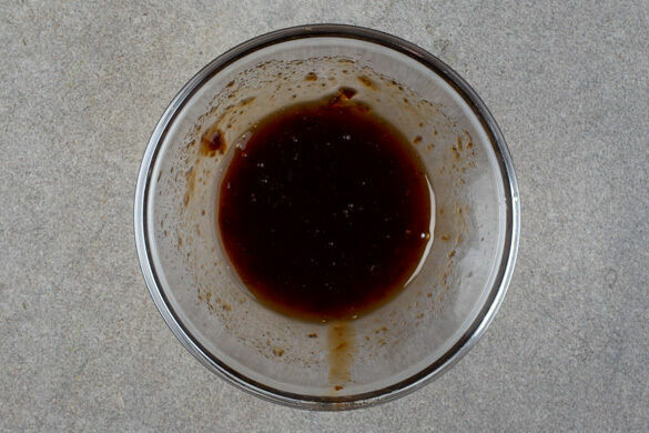 In einem Wasserkocher 1,2L Wasser zum Kochen bringen. Den Knoblauch schälen und fein würfeln. Die Zitrone halbieren und eine Hälfte auspressen, die andere Hälfte in Spalten schneiden. Den Lauch längs vierteln und in ca. 1cm breite Streifen schneiden.