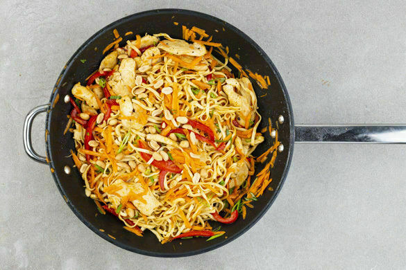 Die Nudeln in der Pfanne mit 2EL Pflanzenöl bei mittlerer Hitze 1–2Min. braten. Die Karotten, das Fleisch und die Paprika untermengen und alles 3–4Min. mitbraten. Mit dem Soja-Sesam-Dressing ablöschen und die Lauchzwiebeln unterheben. Die Hähnchen-Nudelpfanne auf Teller verteilen und mit den Erdnüssen garniert servieren.