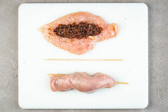 Das Fleisch trocken tupfen, zwischen Frischhaltefolie mit einer schweren Pfanne oder einem Fleischklopfer ca. 0,5cm dünn ausklopfen und von beiden Seiten mit je 1 kräftigen Prise Salz und Pfeffer würzen. Die Füllung auf dem Fleisch verteilen, das Fleisch aufrollen und die Rouladen mit einem Zahnstocher oder Schaschlikspieß fixieren.