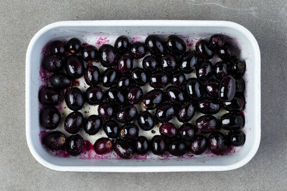 Die Weintrauben mit 1EL Olivenöl und je 1 Prise Salz und Pfeffer vermengen. Im Ofen 6–8Min. rösten, bis die Weintrauben etwas braun werden. Zwischendurch wenden. Aus dem Ofen nehmen und beiseitestellen.