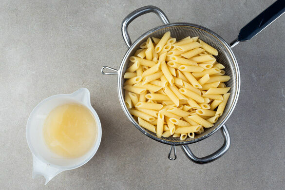 Die Pasta in die kochende Brühe geben und in 6–8Min. bissfest kochen. Ca. 200ml Brühe abschöpfen, dann die Pasta in ein Sieb abgießen und abtropfen lassen.