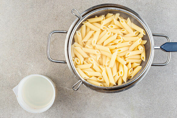 Die Pasta in das kochende Wasser geben und in 6–8Min. bissfest kochen. 100ml Pastawasser abschöpfen, dann die Pasta in ein Sieb abgießen und abtropfen lassen.