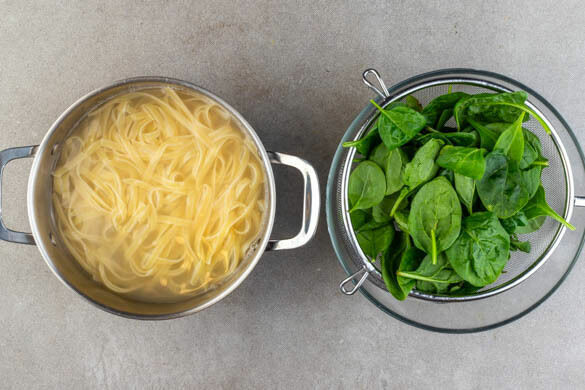In einem großen Topf ausreichend gesalzenes Wasser für die Pasta zum Kochen bringen. Die Pasta in das kochende Wasser geben und in 7–8Min. bissfest kochen. Mit einer Tasse etwas Pastawasser abschöpfen, dann die Pasta über die ½ des Spinats in ein Sieb abgießen und abtropfen lassen. Die Pasta und den erwärmten Spinat zurück in den Topf geben und abgedeckt warm halten.