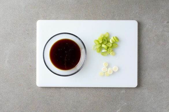 In einem mittelgroßen Topf ausreichend gesalzenes Wasser für die Nudeln zum Kochen bringen. Das Sesamöl mit 1TL Sambal Oelek verrühren und mit 1 Prise Salz würzen. Die Lauchzwiebel schräg in feine Ringe schneiden, den weißen und grünen Teil getrennt voneinander aufbewahren.