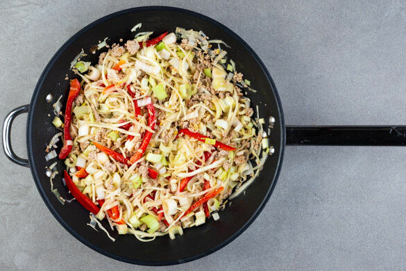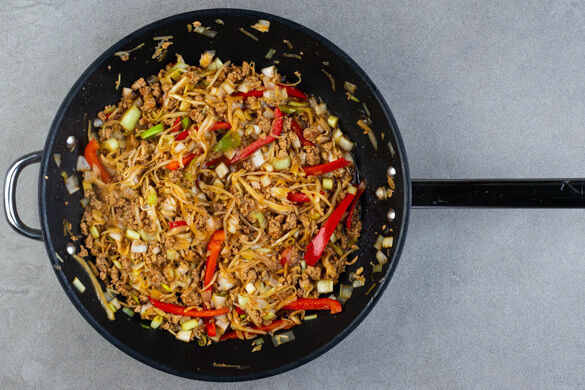 Das Hackfleisch in einer großen Pfanne mit 1TL Pflanzenöl bei mittlerer Hitze 4–5Min. goldbraun anbraten. Den Pak Choi längs halbieren und quer in feine Streifen schneiden, in die Pfanne geben und 3–4Min. mitbraten.