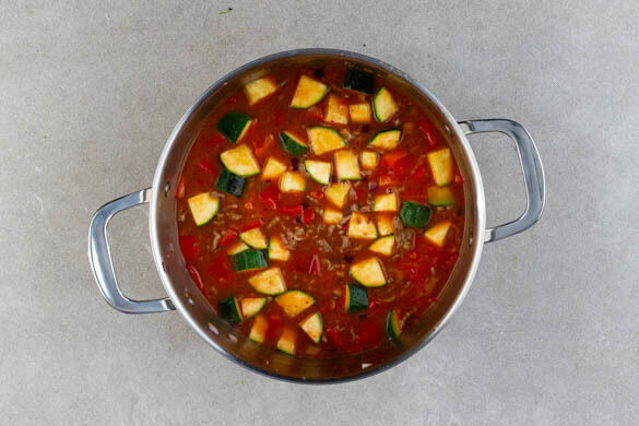 Die Zucchini, die Paprika, die ½ der Zwiebeln, den Knoblauch und 1TL Salz untermengen und ca. 2Min. mitbraten. Die Tomaten, 400ml Wasser und das Brühgewürz unterrühren und alles abgedeckt bei mittlerer Hitze ca. 10Min. köcheln lassen, dabei gelegentlich umrühren.