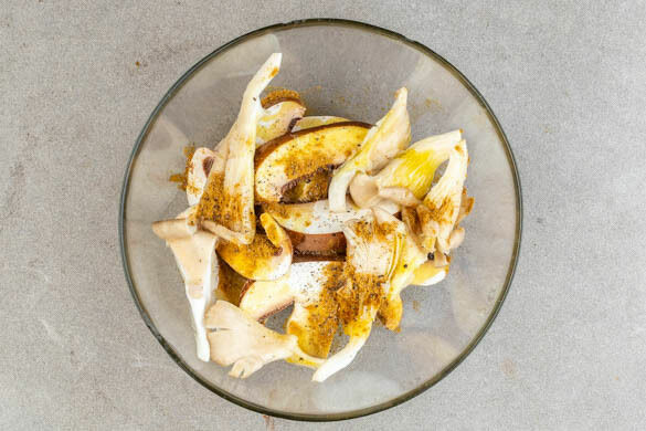 Den Backofen auf 240°C (220°C Umluft) vorheizen. Die Portobello-Pilze in ca. 1cm dicke Scheiben schneiden. Die Austernpilze in Streifen zupfen. Die Pilze mit 2EL Olivenöl, der Gewürzmischung und je ½TL Salz und Pfeffer vermengen.