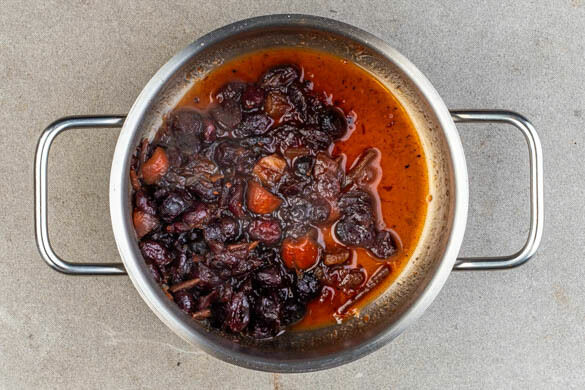Die Cranberrys, die Datteln, 100ml Wasser, 2EL Balsamicoessig, 2EL Zucker und je 1 Prise Salz und Pfeffer in einen kleinen Topf geben und zum Kochen bringen. 5–6Min. köcheln lassen, bis das Chutney etwas eindickt, dann vom Herd nehmen.