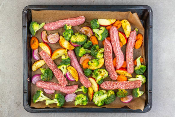 Die Würste längs halbieren. Mit den Karotten, dem Brokkoli, den Zwiebeln und den Äpfeln auf einem mit Backpapier ausgelegten Backblech mit 2EL Olivenöl, dem Gulaschgewürz und ½TL Salz vermengen und 18–22Min. im Ofen backen, bis die Würste appetitlich gebräunt und durchgegart sind.