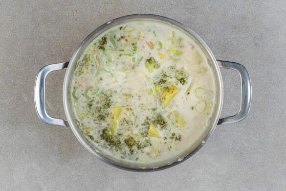 500ml Milch und 300ml Wasser unter stetigem Rühren langsam angießen und aufkochen lassen, ggf. die Hitze verstärken. Die Kartoffeln schälen und je nach Größe halbieren oder vierteln, dann in den Topf geben. Die Fischsauce und die Gewürzmischung unterrühren und die Suppe abgedeckt 15–20Min. sanft kochen lassen.