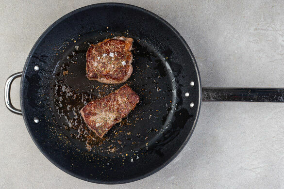 Das Fleisch trocken tupfen, von beiden Seiten mit der Gewürzmischung und je 1 Prise Salz und Pfeffer würzen und in einer großen Pfanne mit 2EL Pflanzenöl bei starker Hitze auf jeder Seite 2–3Min. braten, abhängig davon, ob es medium oder eher durchgebraten sein soll. Aus der Pfanne nehmen und bis zum Servieren auf einem Teller abgedeckt ruhen lassen.