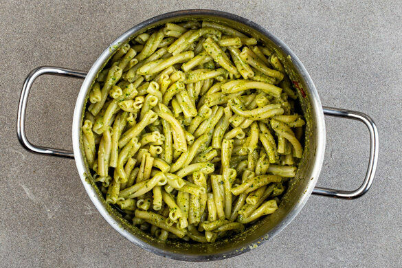 Das Basilikum samt Stängeln grob schneiden und in ein hohes Gefäß geben. Den Käse fein reiben. Die ½ des Käses und ¾ der Walnüsse zu dem Basilikum geben und alles mit 3EL Olivenöl mit einem Stabmixer fein pürieren. Mit Salz und Pfeffer abschmecken und 5–6EL Wasser dazugeben, das Pesto sollte schön cremig sein.