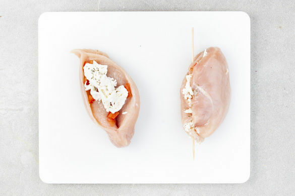 Das Fleisch trocken tupfen, jeweils längs halbieren und dann mit einem scharfen Messer waagerecht je eine Tasche einschneiden. Den Mozzarella mit 2 Prisen Gewürzmischung vermengen und mit der ½ der Tomaten in die Hähnchentaschen füllen. Die Öffnung mit je 1 Zahnstocher verschließen.