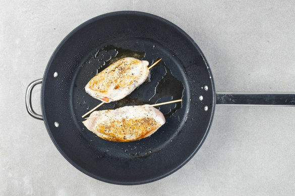 Die Hähnchentaschen mit Salz und Pfeffer würzen und in einer mittelgroßen, ofenfesten Pfanne mit 1EL Olivenöl bei mittlerer Hitze auf jeder Seite 1–2Min. anbraten. Anschließend 9–12Min. im Ofen weitergaren, bis das Fleisch in der Mitte durch ist. Tipp: Wer keine ofenfeste Pfanne hat, kann das Fleisch nach dem Anbraten in eine Auflaufform geben.