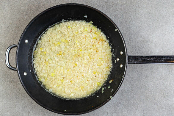 Die Zwiebeln in einer großen Pfanne mit 2EL Olivenöl bei mittlerer Hitze 1–2Min. farblos anschwitzen. Den Reis dazugeben und ca. 1Min. mitbraten. Nach und nach unter Rühren die Brühe zugeben und einköcheln lassen, bis die gesamte Brühe aufgebraucht ist, das dauert 18–20Min. Das Risotto sollte sämig sein, der Reis aber noch Biss haben.