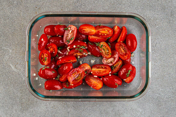 Die Tomaten halbieren und mit dem Knoblauch, der ½ des Thymians und 2EL Olivenöl in einer Auflaufform vermengen. Mit je 1 kräftigen Prise Salz, Pfeffer und Zucker würzen und die Tomaten 10–12Min. im Ofen backen.