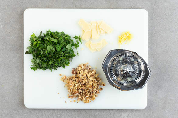 Die Walnüsse in einer mittelgroßen Pfanne ohne Zugabe von Fett bei mittlerer Hitze 1–2Min. goldbraun anrösten. Vorsicht, sie können schnell zu dunkel werden. Währenddessen die Kräuter samt Stängeln fein schneiden. Die Walnüsse fein hacken. Die Zitronenschale abreiben, dann die Zitrone halbieren und auspressen. Den Käse mit einem Sparschäler in breite Streifen schneiden.