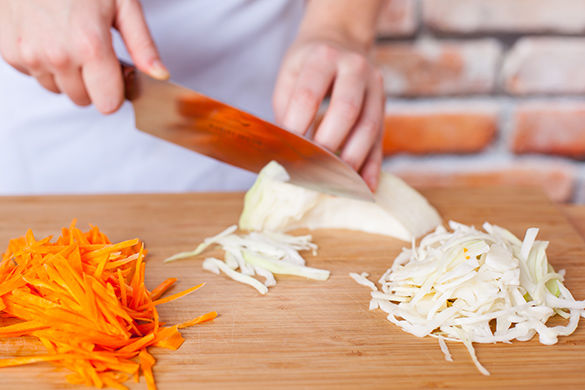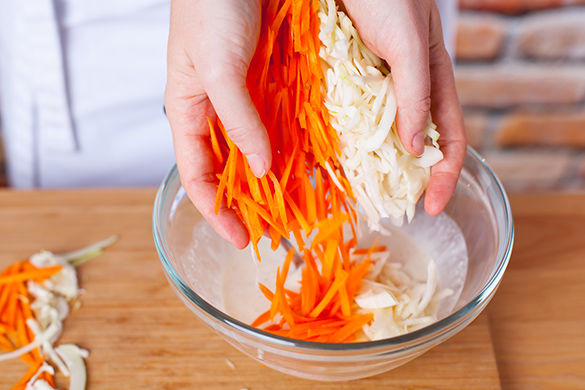 Inzwischen Karotten schälen, in ca. 2mm dünne, ca. 3-4cm lange Streifen schneiden oder mit Küchenreibe hobeln. Weißkohl waschen, in feine Streifen schneiden. Zitrone waschen, Schale mit der feinen Seite der Küchenreibe reiben, Saft dazupressen. Alles beiseitestellen.