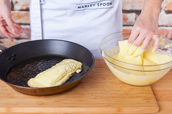 Eine große Pfanne mit 8EL Öl auf mittlere Stufe erhitzen, das Öl wird zum Ausbacken benötigt. Die Fischfilets von allen Seiten mit Mehl bestäuben und mit den Fingern durch den Backteig ziehen.
