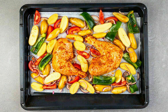 Das Fleisch zwischen dem Gemüse platzieren und alles 25–30Min. im Ofen backen, bis das Fleisch gar und appetitlich gebräunt ist. Nach der Hälfte der Zeit die Position der Bleche tauschen.