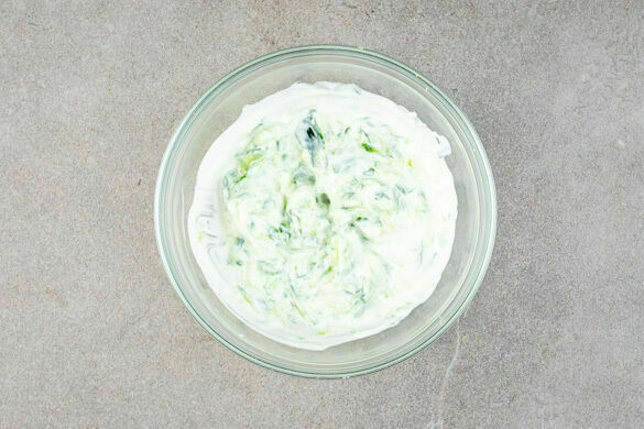 Die Gurke mit einer Küchenreibe grob raspeln. Den Knoblauch schälen und fein reiben. Die Gurkenraspel mit dem Knoblauch und dem Joghurt vermengen. Mit Salz und Pfeffer abschmecken.