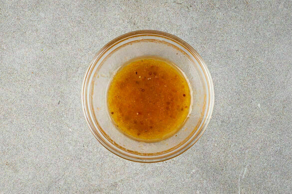 Das Aprikosenchutney mit 1EL Senf, 1–2TL Olivenöl und 2EL Essig verrühren. Mit Salz und Pfeffer abschmecken.